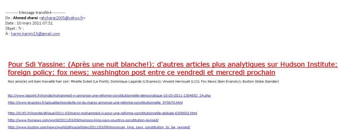 De cette époque, Chris Coleman nous apporte un email date du 18/07/2008, dans lequel Ahmed Charai annonçait au patrón de la DGED que la journaliste « Dominique Lagarde de l’Express a accepté de venir au Maroc pour la journée du Mardi 22 juillet ».