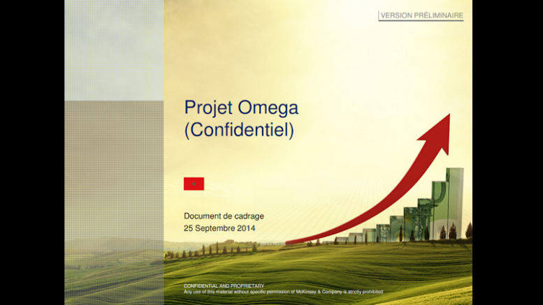 Un compte twitter @chris_coleman24, spécialisé dans la la fuite de documents sensibles pour le gouvernement marocain, a diffusé ce mercredi une proposition commerciale de McKinsey pour le gouvement marocain. Datée du 25 septembre 2014, ce « document de cadrage » est relatif au projet Omega destiné à relancer l’économie. Il s’inscrit dans la suite du Plan Emergence sur lequel a travaillé le cabinet de conseil en stratégie.