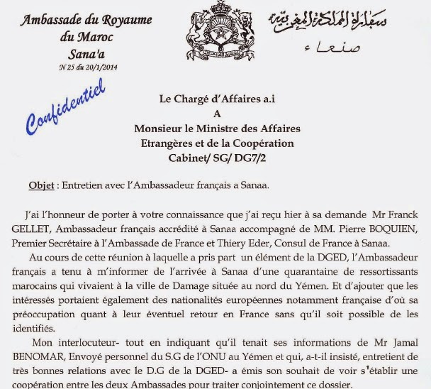 Dans le cadre du Wikileaks du Maroc, un nouveau document reprend les soucis de la France par rapport à des marocains se trouvant au Yémen. Il s’agit d’une lettre envoyée par l’ambassadeur du Maroc à Sanaa où il fait état du contenu d’un entretien avec l’ambassadeur de la France dans ce pays. En voici le texte intégral :