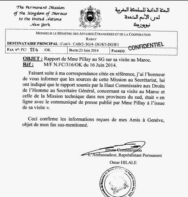 Dans une correspondance datée du 23 juin 2014, Omar Hilale fait état de « sources de cette mission au Secrétariat » qui lui « ont indiqué que le rapport soumis par la Haut Commissaire aux Droits de l’Homme au Secrétaire Général concernant sa visite au Maroc et celle de la Mission technique dans nos provinces du sud, était « en ligne avec le communiqué de presse publié par Mme Pillay à l’issue de sa visite ».