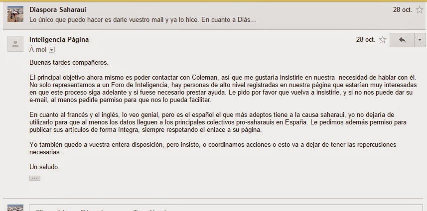 Dans un autre courrier en date du 27 octobre, j’ai reçu un nouveau courrier. Ils y demandent à nouveau que Coleman contactent leur service. « Nous aimerios avoir des directives marquées par lui pour mener une action coordonnée de publications sur Intelpage et contre le Maroc. Nous voulons aussi savoir si vous avez besoin d’un soutient depuis l’Espagne. Il est important que le Maroc soit puni. Comme vous le savez, nous sommes un Forum d’intelligence qui a beaucoup de relations et nous ont tracé ces directrices `pour agir avec vous. Merci beaucoup ».