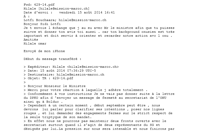 > Expéditeur: Hilale > Date: 15 août 2014 07:36:29 UTC-5 > Destinataire: hilale@mission-maroc.ch > Objet: TR : 429-14.pdf > > Bonjour Monsieur le Ministre > Merci pour votre réaction à laquelle j adhère totalement . > Conformément à vos instructions Je ne vais pas donner suite à la lettre du DPKO afin d ‘envoyer un message de fermeté au secretariat de l’ONU ainsi qu à Bolduc . > Cependant à un certain moment , début septembre peut être , nous devrons lui parler pour clarifier ses intentions , poser nos lignes rouges , et lui demander des engagements fermes sur le strict respect de la seule triptyque de son mandat. > En effet nous ne pourrons pas maintenir deux fronts ouverts avec le secretariat surtout quand il s’agit de deux représentants du SG et désignés par lui.La pression sur nous sera intenable et nous finirons par céder sans rien obtenir . > Par contre ,si début septembre on obtient les garanties souhaitées de Bolduc et on la laisse regagner son poste ,on sera plus à l ‘aise sur le front de Ross .Car le grand danger c’est Ross qu il convient d ‘immobiliser voire le morpholer en utilisant sa propre méthode : une pression constante sur lui et le secretariat . > Je reste dans l ‘attentes de vos instructions . > A mon tour d espérer que vous passez de bonnes vacances et que vous vous reposez bien car vous en avez le plus grand besoin . > Très hautes considérations > Omar hilale > > Envoyé de mon iPhone > > Début du message transféré : > >> Expéditeur: SALAHEDDINE MEZOUAR >> Date: 15 août 2014 03:12:46 UTC-5 >> Destinataire: Hilale >> Objet: Rép : 429-14.pdf >>
