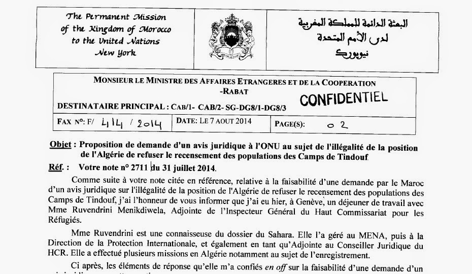 Comme suite à votre note citée en référence, relative à la faisabilité d’une demande par le Maroc d’un avis juridique sur l’illégalité de la position de l’Algérie de refuser le recensement des populations des Camps de Tindouf, j’ai l’honneur de vous informer que j’ai eu hier, à Genève, un déjeuner de travail avec Mme Ruvendrini Menikdiwela, Adjointe de l’Inspecteur Général du Haut Commissariat pour les Réfugiés. Mme Ruvendrini est une connaisseuse du dossier du Sahara. Elle l’a géré au MENA, puis à la Direction de la Protection Internationale, et également en tant qu’Adjointe au Conseiller Juridique du HCR. Elle a effectué plusieurs missions en Algérie notamment au sujet de l’enregistrement. Ci après, les éléments de réponse qu’elle m’a confiés en offsur la faisabilité d’une demande d’un avis juridique sur cette question :