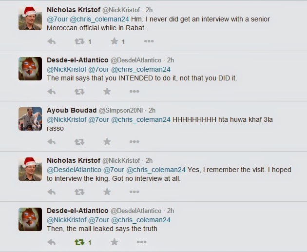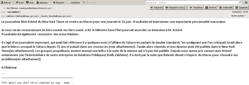 Dans un email envoyé, le 07/06/2011, Aziz Mekouar , ancien ambassadeur du Maroc aux Etats-Unis, annonce à Taïeb Fassi Fihri, MAE à l’époque, que le journaliste du NYT, Nick Kristof, se rendra au Maroc le 16 juin et qu’il « souhaite interviewer une importante personnalité marocaine ».