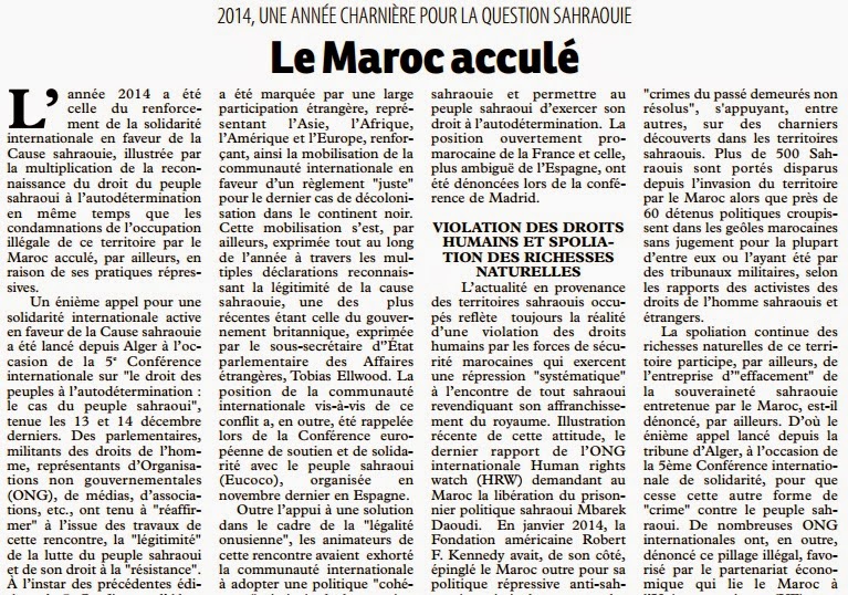 L’année 2014 a été celle du renforcement de la solidarité internationale en faveur de la Cause sahraouie, illustrée par la multiplication de la reconnaissance du droit du peuple du Sahara Occidental à l’autodétermination en même temps que les condamnations de l’occupation illégale de ce territoire par le Maroc acculé, par ailleurs, en raison de ses pratiques répressives.