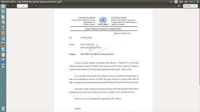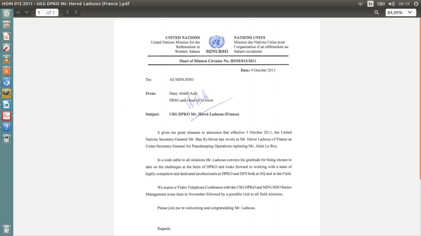 – Lettre envoyée le 4/10/2011 par le Chef de la MINURSO, Hany Abdelaziz, à toutes les antennes de la MINURSO les informant de la désignation de Hervé Ladsous en tant que vice-secrétaire général pour les forces de maintien de paix à la place de Alain Le Roy.