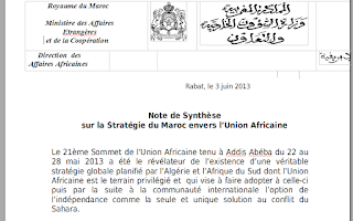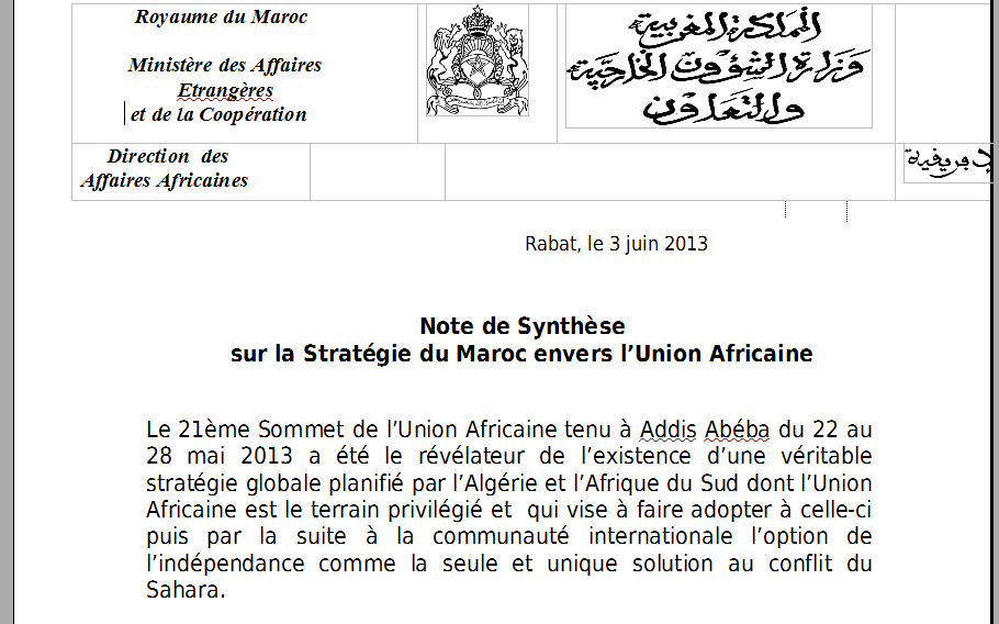 Le 21ème Sommet de l’Union Africaine tenu à Addis Abéba du 22 au 28 mai 2013 a été le révélateur de l’existence d’une véritable stratégie globale planifié par l’Algérie et l’Afrique du Sud dont l’Union Africaine est le terrain privilégié et qui vise à faire adopter à celle-ci puis par la suite à la communauté internationale l’option de l’indépendance comme la seule et unique solution au conflit du Sahara.