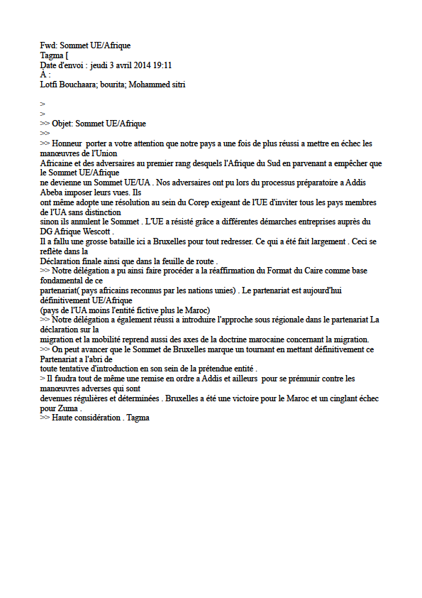 >> Honneur porter a votre attention que notre pays a une fois de plus réussi a mettre en échec les manœuvres de l’Union Africaine et des adversaires au premier rang desquels l’Afrique du Sud en parvenant a empêcher que le Sommet UE/Afrique ne devienne un Sommet UE/UA . Nos adversaires ont pu lors du processus préparatoire a Addis Abeba imposer leurs vues. Ils ont même adopte une résolution au sein du Corep exigeant de l’UE d’inviter tous les pays membres de l’UA sans distinction