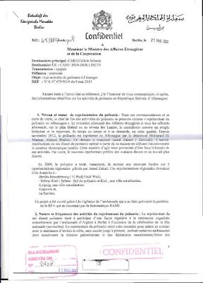 La boite mail de Mohamed Ali Zerouali, alias Jamal Zakari, était surveillée par des membres de l’Ambassade du Maroc en Allemagne, rapporte une lettre confidentielle envoyée le 9 mai 2013 par l’ambassadeur du Maroc en Allemagne, Omar Zniber.