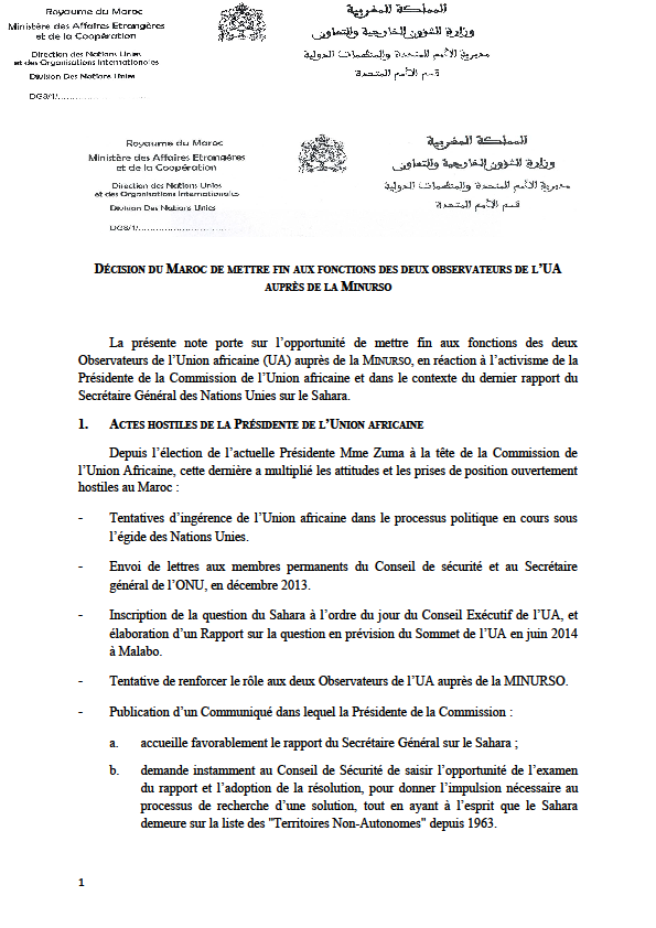 La présente note porte sur l’opportunité de mettre fin aux fonctions des deux Observateurs de l’Union africaine (UA) auprès de la Minurso, en réaction à l’activisme de la Présidente de la Commission de l’Union africaine et dans le contexte du dernier rapport du Secrétaire Général des Nations Unies sur le Sahara.