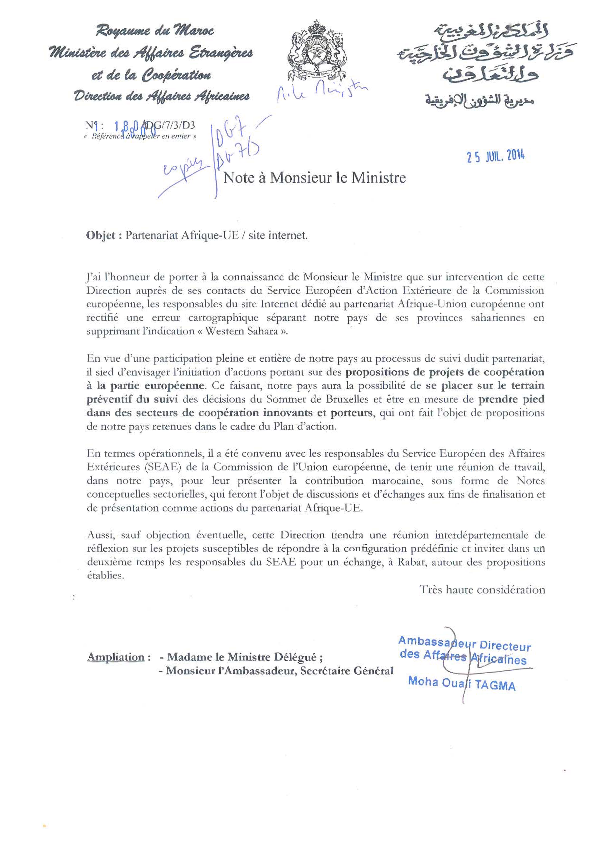 « J’ai l’honneur de porter á la connaissance de Monsieur le Ministre que sur intervention de cette Direction aurpès de ses contacts du Service Européen d’Action Extérieure de la Commission européenne, les responsables du site Internet dédié au partenariat Afrique-Union européenne ont rectifé une erreur cartographique sáparant notre pays de ses provinces sahariennes en supprimant l’indication « Western Sahara », indique la note.