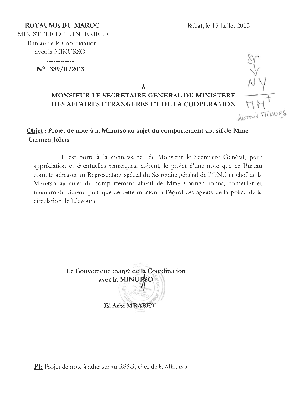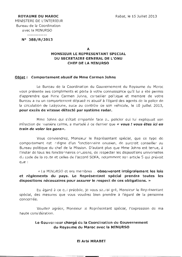 Selon une note envoyée par le Bureau de la Coordination avec la MINURSO (Mission des Nations Unies pour le Référendum au Sahara Occidental) le 15 juillet 2013 et signée par le Gouverneur chargé de la Coordination avec la MINURSO El Arbi MRABET, celui-ci soumet au Secrétaire Général du Ministère des Affaires Etrangères du Maroc, un projet de note à envoyer au SG des Nations Unies, Ban Ki-moon pour protester contre le « comportement de Mme Carmen Johns, membre de la MINURSO.