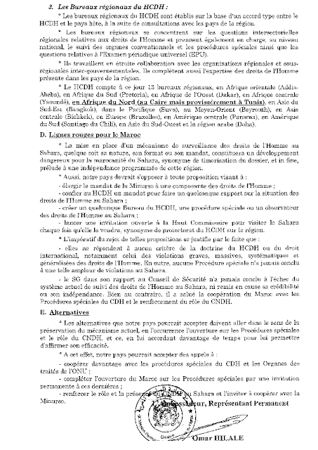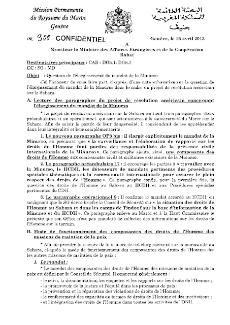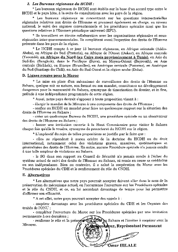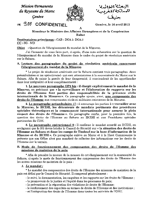 Pour le Maroc, accepter l’élargissement du mandat de la MINURSO ou la mise en place d’un mécanisme de surveillance des droits de l’homme est « synonyme de timorisation du dossier, et in fine, prélude à une indépendance programmée de cette région », selon les termes de l’ambassadeur Omar Hilale dans une note envoyée à son ministère.