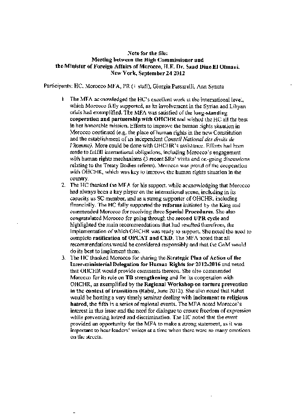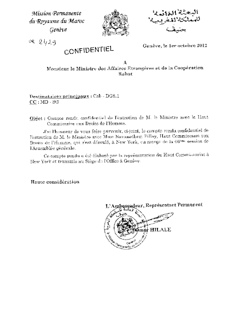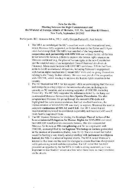 Le suédois Anders Kompass, directeur des opérations de champ au HCDH passait régulièrement au Représentant Permanent du Maroc à Genève des documents confidentiels sur le Sahara Occidental. Vous trouverez ici un compte-rendu d’une réunion entre le ministre marocain des affaires étrangères et la Haut Commissaire pour les Droits de l’Homme.