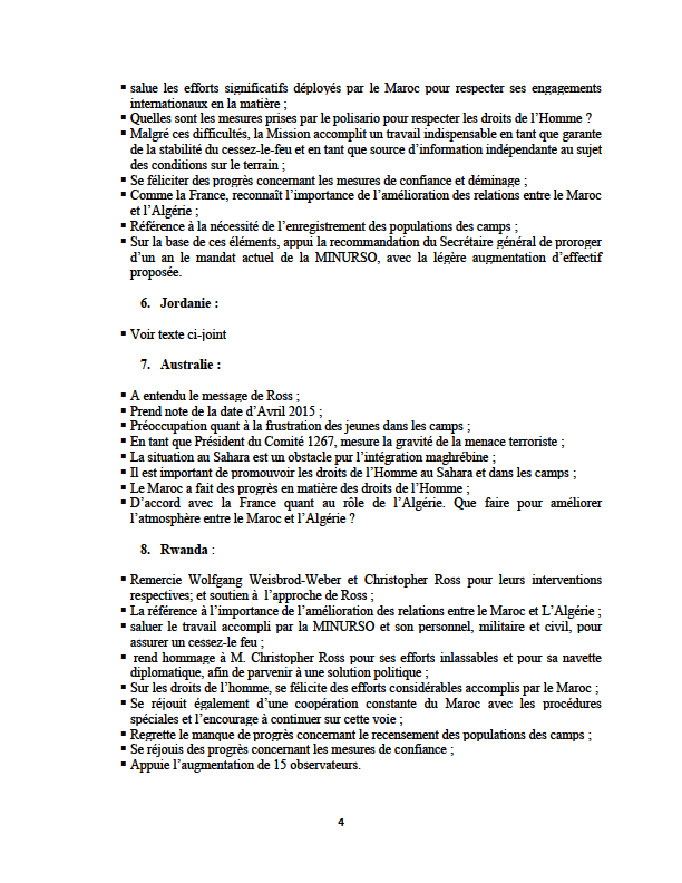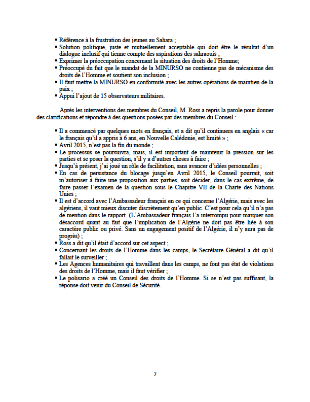 Compte rendu détaillé des briefings du Représentant Spécial W. Wolfgang Weber et de l’Envoyé personnel Christopher Ross pour le Sahara Occidental ainsi que des interventions des membres du Conseil lors des consultations privées, tenues ce matin, au sujet du conflit sahraoui.