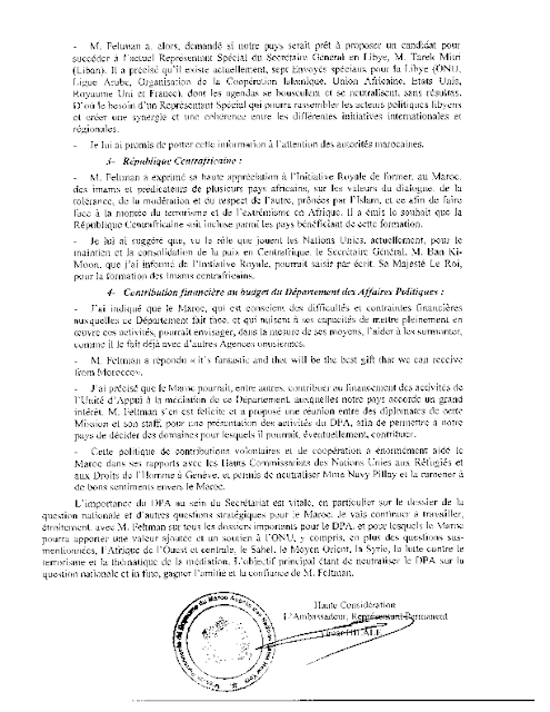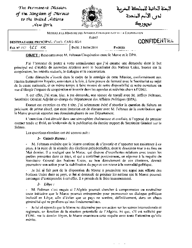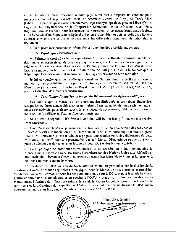 « L’importance du DPA au sein du Secrétariat est vitale, en particulier sur le dossier de la question nationale et d’autres questions stratégiques pour le Maroc. Je vais continuer à travailler, étroitement, avec M. Feltman sur tous les dossiers importants pour le DPA, et pour lesquels le Maroc pourra apporter une valeur ajoutée et un soutien à l’ONU, y compris, en plus des questions susmentionnées, l’Afrique de l’Ouest et centrale, le Sahel, le Moyen Orient, la Syrie, la lutte contre le terrorisme et la thématique de la médiation. L’objectif principal étant de neutraliser le DPA sur la question nationale et in fine, gagner l’amitié et la confiance de M. Feltman », conclue-t-il.