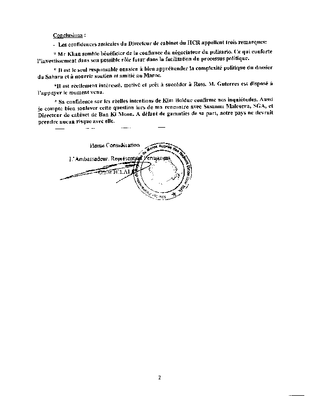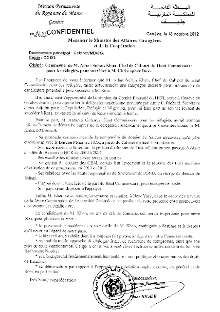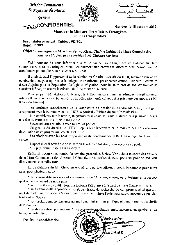 Athar Khan aspirait au poste d’Envoyé Personnel du Secrétaire Général de l’ONU pour le Sahara Occidental. Pour réaliser ses desseins, il comptait utiliser la diplomatie marocaine à travers l’ancien ambassadeur du Maroc à Genève, Omar Hilale, qui représente actuellement son pays auprès des Nations Unies à New York.