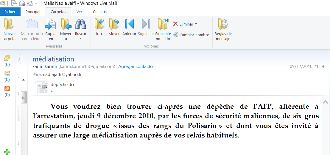 Mourad El Ghoul, chef de Cabinet de Yassine Mansouri, directeur de la DGED, demande dans ce mail à Nadia El Jalfi, un de ses relais de médiatiser une des dépêches du correspondant de l’AFP à Baamako, Serge Daniel. Celui-ci se présentait comme expert en matière de terrorisme auprés de la chaîne France-24 dans laquelle il a largement diffamé contre les sahraouis.