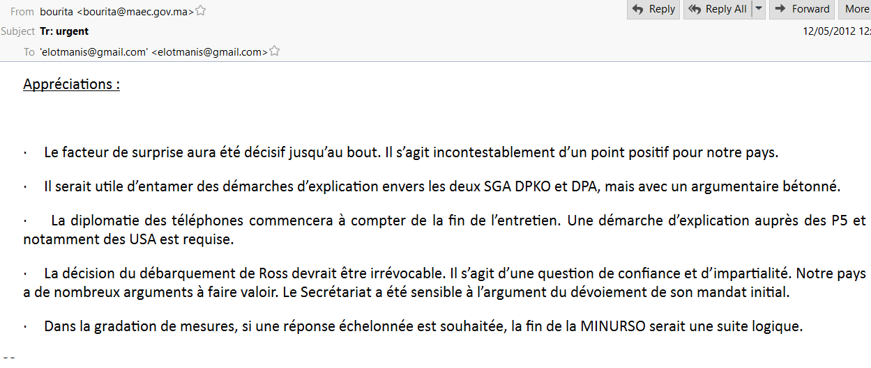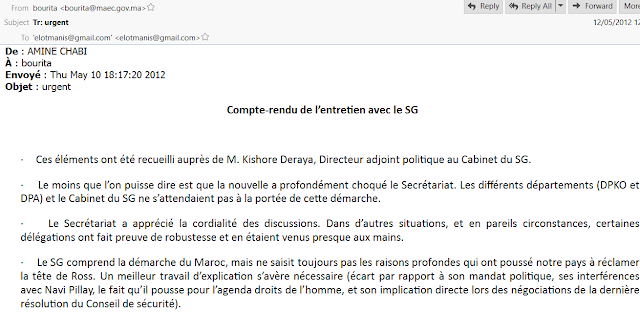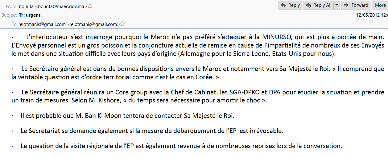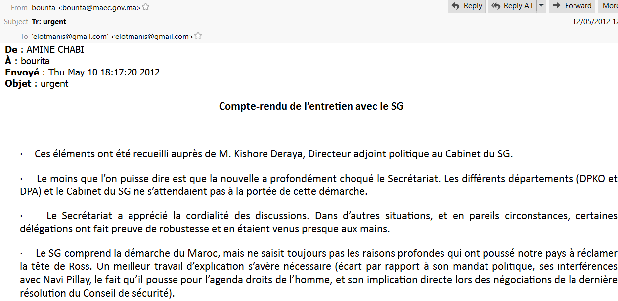« L’Envoyé personnel est un gros poisson et la conjoncture actuelle de remise en cause de l’impartialité de nombreux de ses Envoyés le met dans une situation difficile avec leurs pays d’origine (Allemagne pour la Sierra Leone, Etats-Unis pour nous) » a ajouté Chabi dans un email envoyé au SG du MAE, Nasser Bourita et que celui a transmis à son ministre le 12 mai 2012.