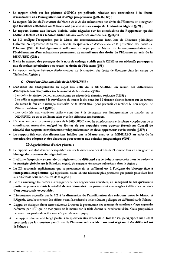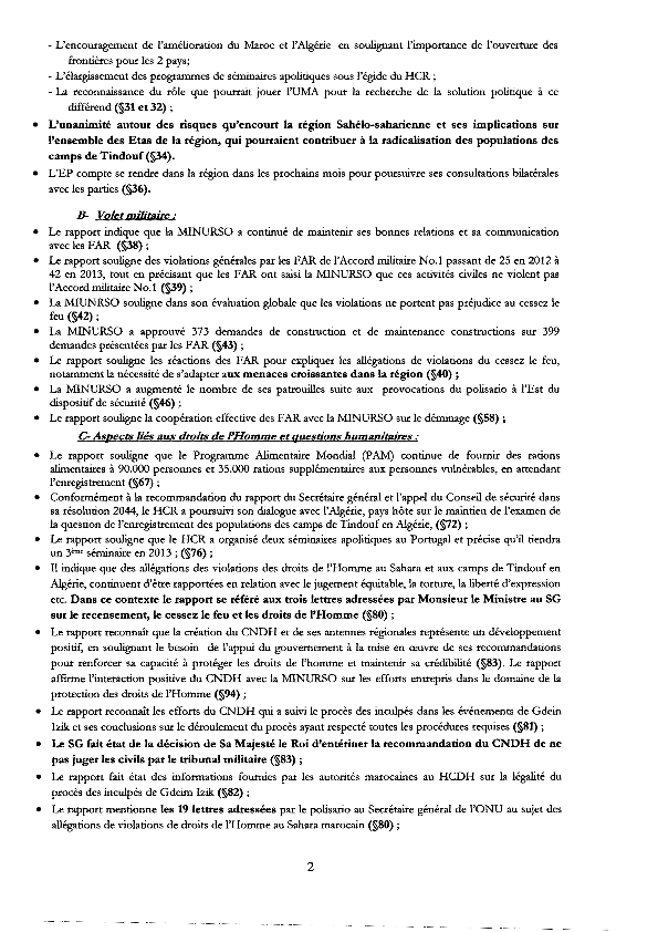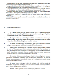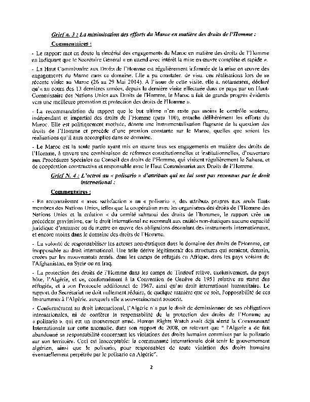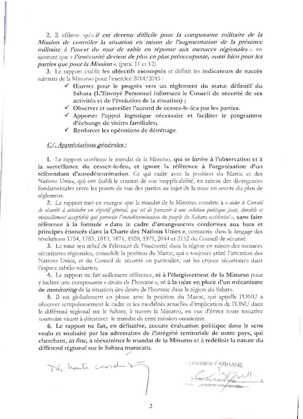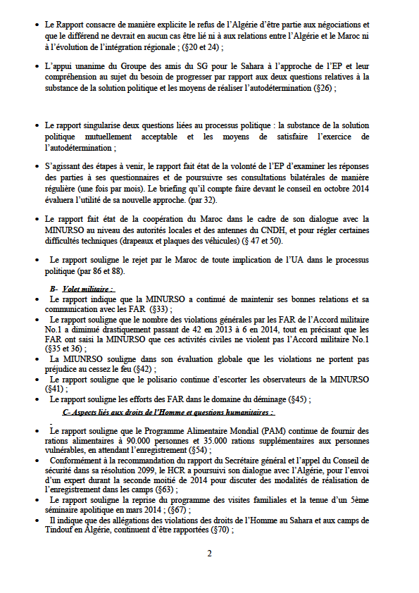 – Analyse préliminaire du rapport du Secrétaire Général de l’ONU de 2014 faite par la Division des Nations Unies du MAE marocain
