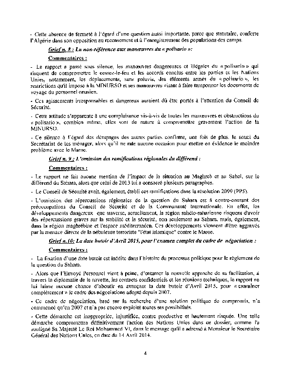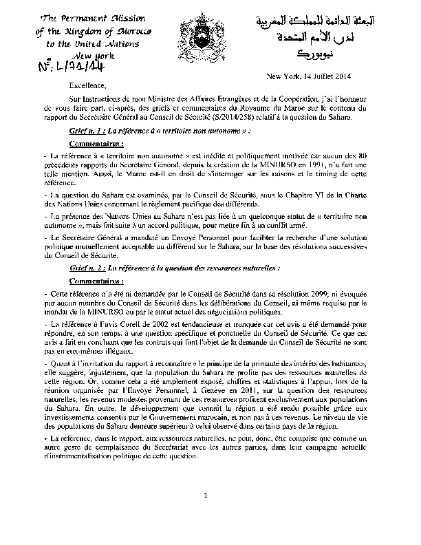 – Griefs et commentaires sur le rapport du SG de l’ONU par Omar Hilale, juillet 2014