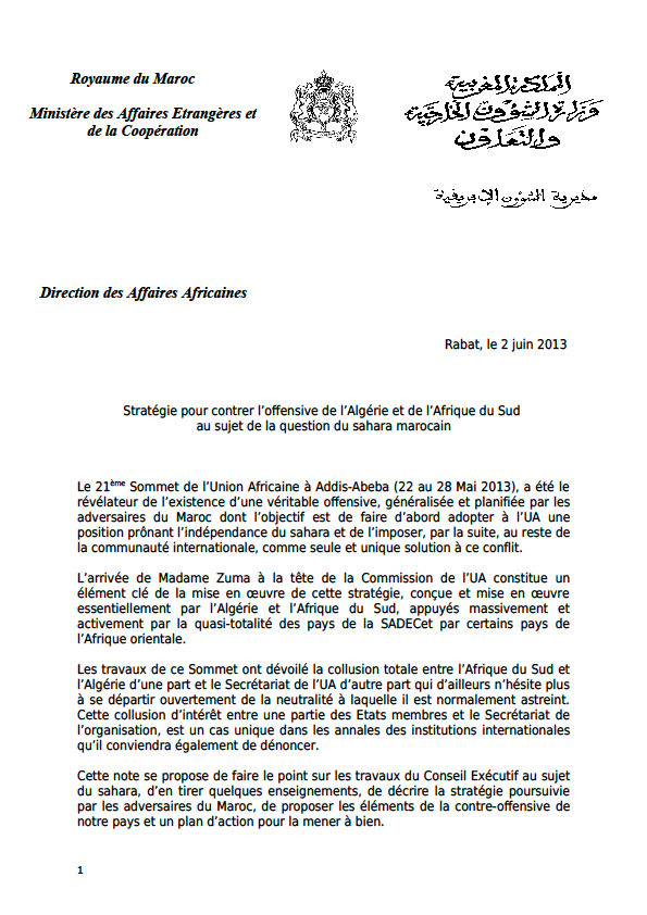 Le premier échelon de la contre-offensive marocaine devra viser d’abord de faire échec à la stratégie adverse à l’occasion de la prochaine session du Conseil Exécutif de l’UA en janvier 2014.