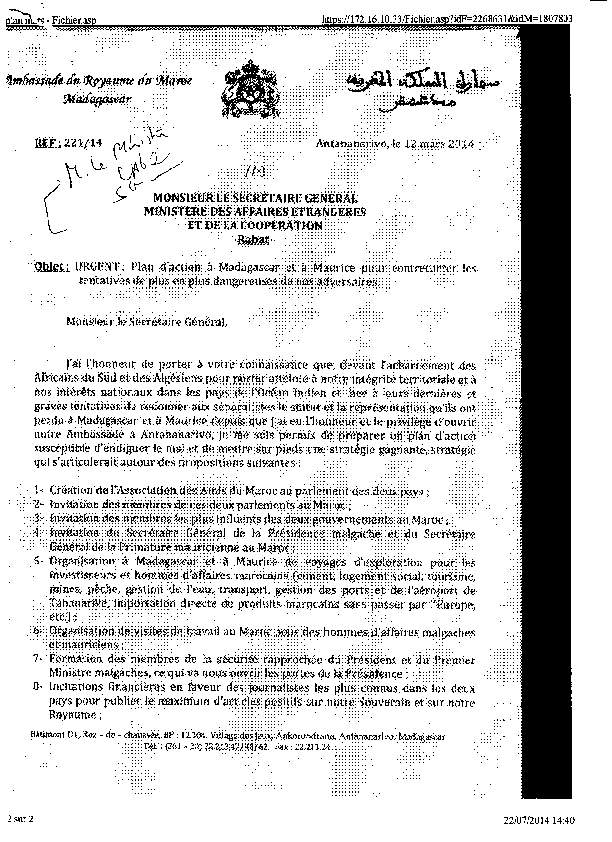 Des démarches doivent être entreprises auprès du Secrétaire Général des Nations Unies pour l’informer des manœuvres visant à saboter le processus de négociation et justifier ainsi la réappropriation par l’UA du dossier du sahara. Il faudra également faire part au Secrétaire Général des Nations Unies du refus du Maroc de voir son Envoyé Personnel rendre compte à l’UA de son mandat.