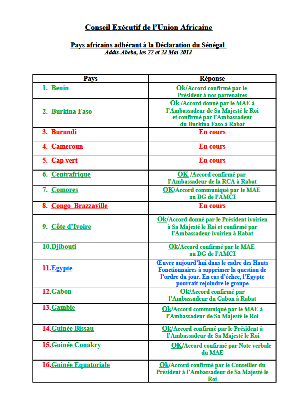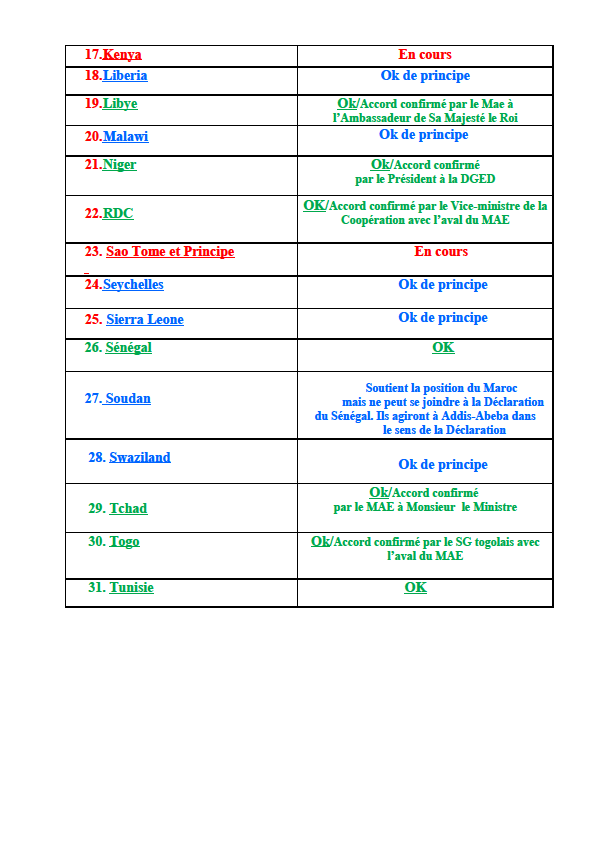 Cette démarche devrait être relayée au niveau des Ministres des Affaires Etrangères de ces pays ainsi qu’auprès de tous les autres échelons : les Ambassadeurs africains à Rabat, les Ambassadeurs du Maroc en Afrique et les Représentants permanents à Addis-Abeba.