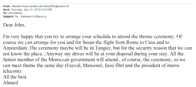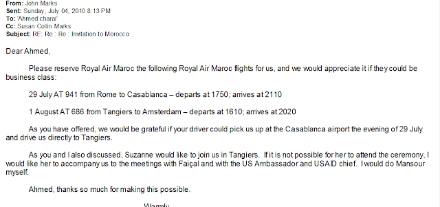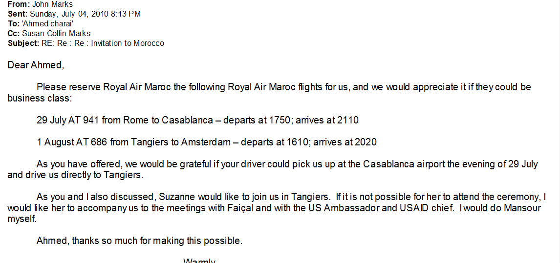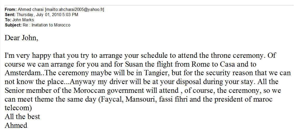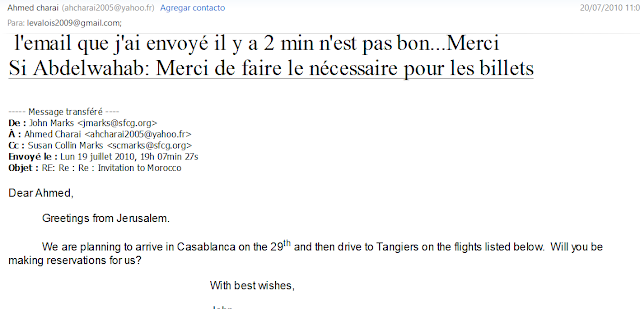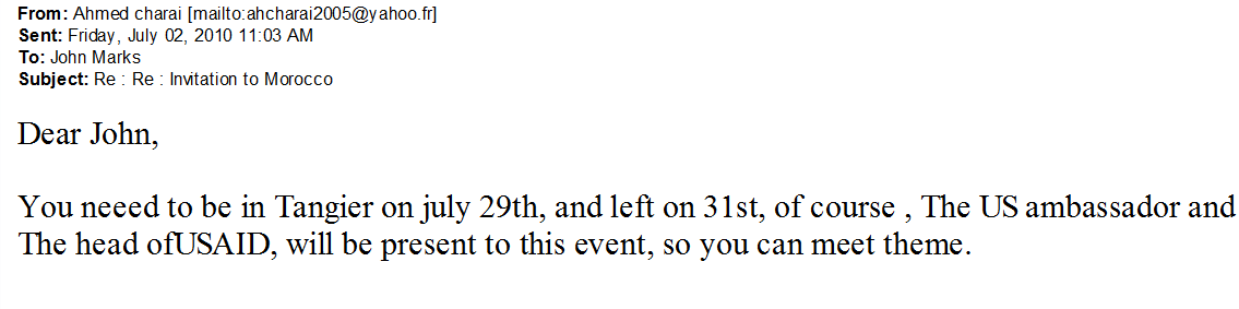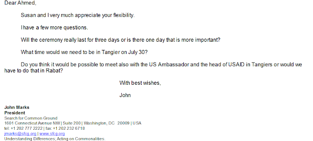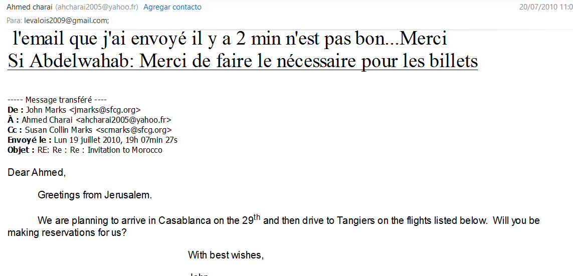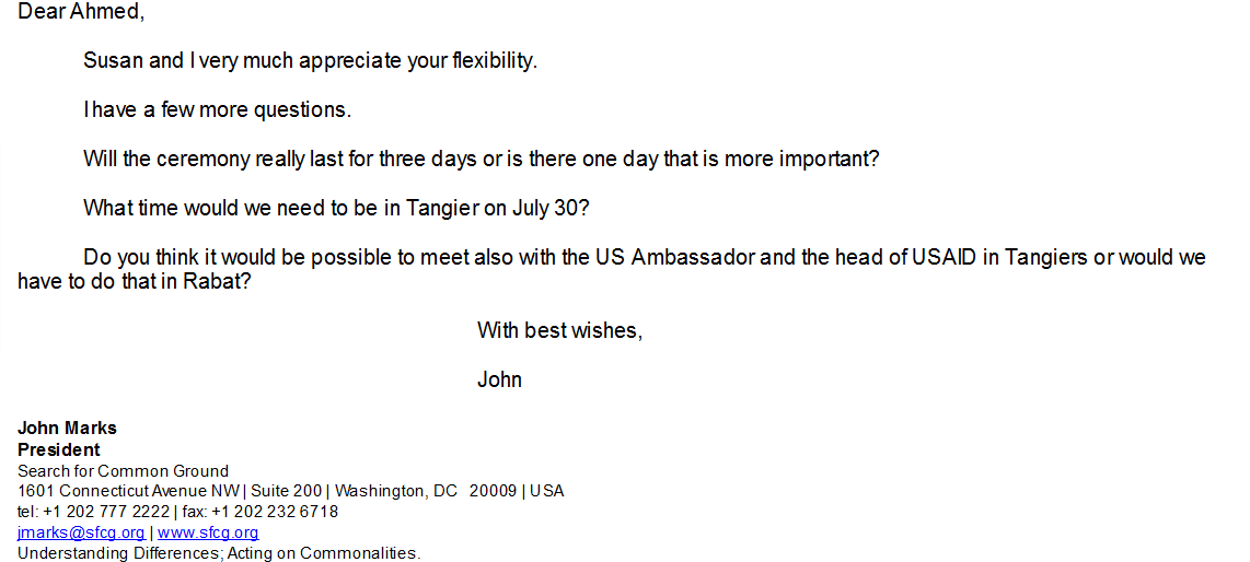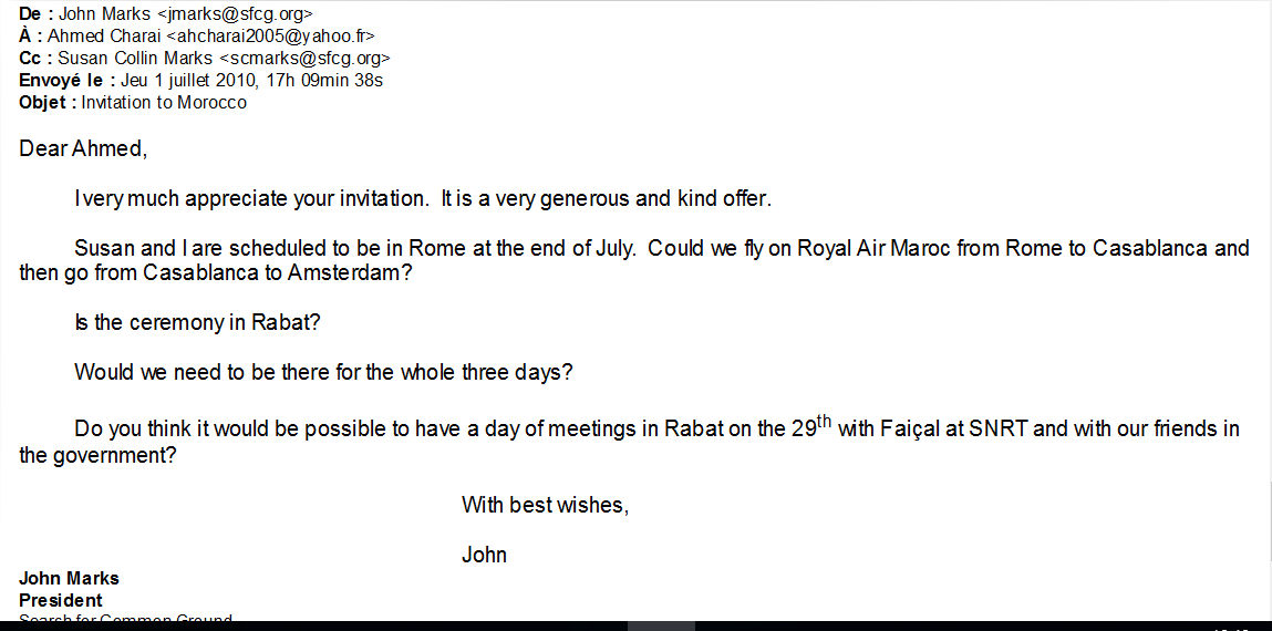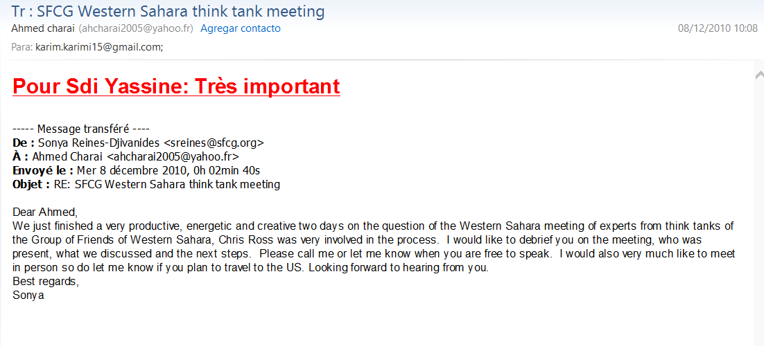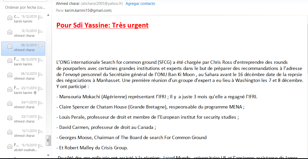 Selon cet email envoyé le 9 décembre 2010 par Ahmed Charai à Mourad El Ghoul, l’Envoyé Personnel du SG de l’ONU pour le Sahara Occidental, Christopher Ross, a contacté l’ONG internationale Search for common ground (SFCG) pour la charger d’entreprendre des rounds de pourparlers avec certaines grandes institutions et experts dans le but de préparer des recommandations à son adresse.