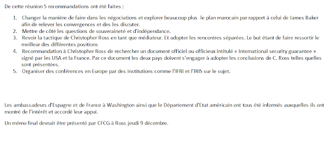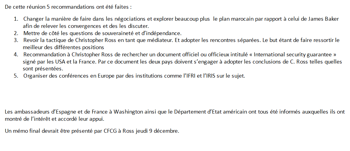 L’ONG internationale Search for common ground (SFCG) a été chargée par Chris Ross d’entreprendre des rounds de pourparlers avec certaines grandes institutions et experts dans le but de préparer des recommandations à l’adresse de l’envoyé personnel du Secrétaire général de l’ONU Ban Ki Moon , au Sahara avant le 16 décémbre date de la reprsie des négociations à Manhasset. Une première réunion d’un groupe d’expert a eu lieu à Washington les 7 et 8 décembre. Y ont participé :