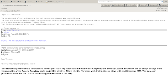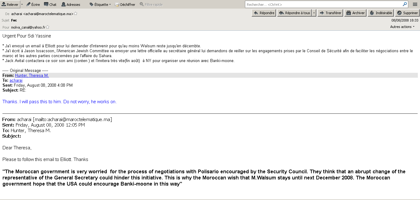 En effet, selon un email envoyé par Ahmed Charai le 8 août 2008, celui-ci informe son chef, Mourad El Ghoul, directeur du cabinet de Yassine Mansourim qu’il a demandé à Elliott Abrams, à l’époque conseiller adjoint du président Bush pour les Affaires de sécurité nationale, chargé de la Stratégie de démocratie globale, « d’intervenir pour qu’au moins Walsum reste jusqu’en décembre. Il a aussi écrit à Jasin Issaacson, de l’American Jewish Committee pour qu’il envoie « une lettre officielle au Secrétaire Général lui demandant de veiller sur les engagements pris par le Conseil de Sécurité afin de faciliter les négociations entre le Maroc et les autres parties concernées par l’affaire du Sahara ».