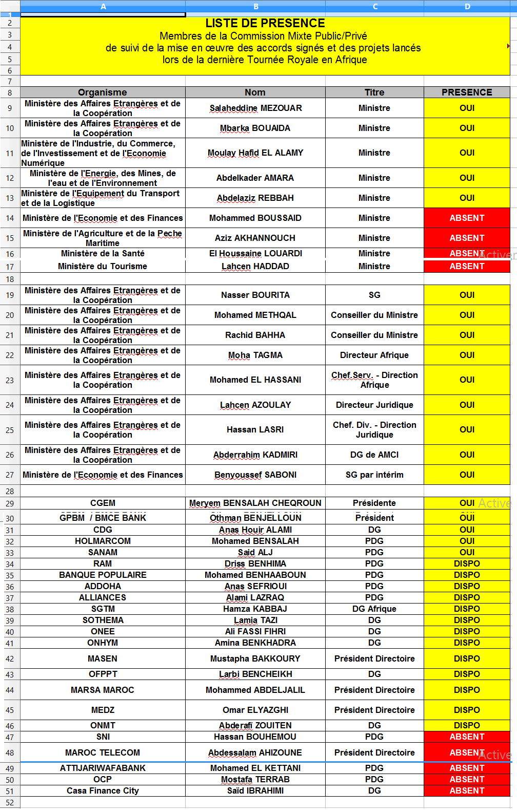 Suite aux Hautes Instructions données par Sa Majesté le Roi Mohammed VI, que Dieu L’assiste, à Monsieur Salaheddine Mezouar, Ministre des Affaires Etrangères et de la Coopération, lors de la dernière réunion du Conseil des Ministres tenue le vendredi 14 mars 2014 à Rabat, Monsieur le Ministre accompagné de Madame la Ministre Déléguée et des hauts responsables du Ministère, a présidé le 19 mars 2014, la première réunion de travail de la Commission Mixte Public/Privé de suivi de la mise en oeuvre des accords signés et des projets lancés lors de la dernière tournée royale en Afrique :