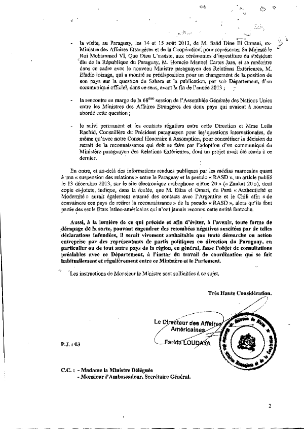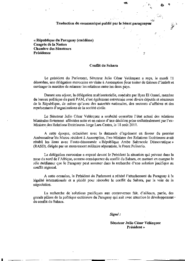 – un projet de communiqué de retrait de la reconnaissance de la pseudo « RASD » par le Paraguay sera transmis incessamment à Mme Leila Rachid afin de concrétiser un tel retrait.