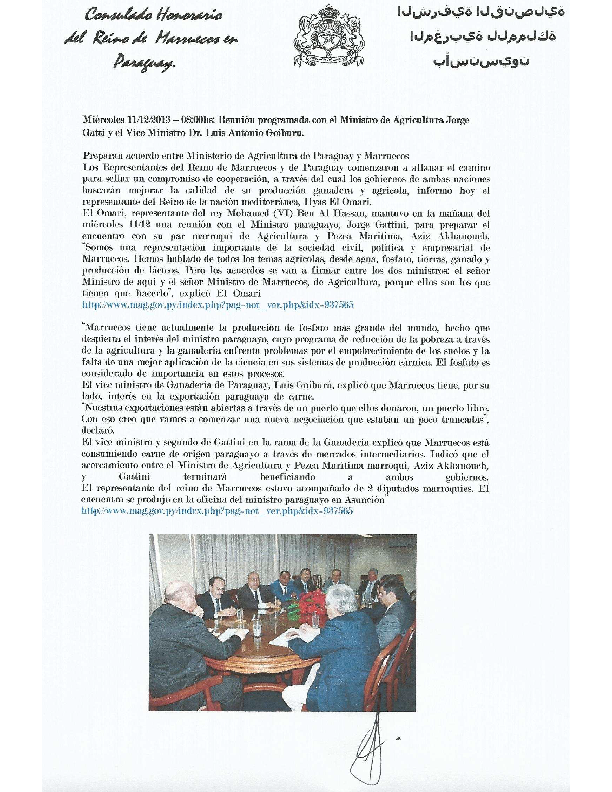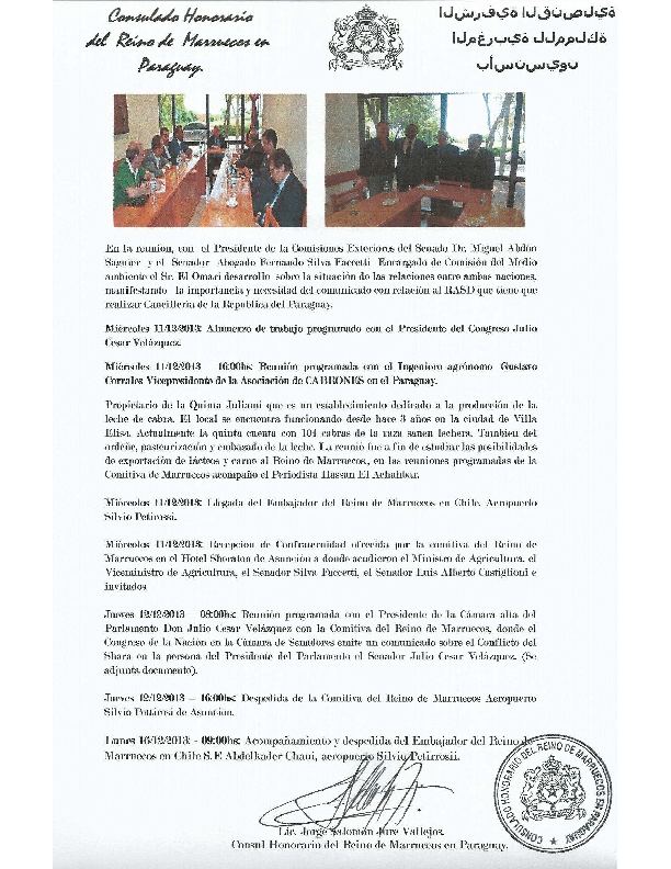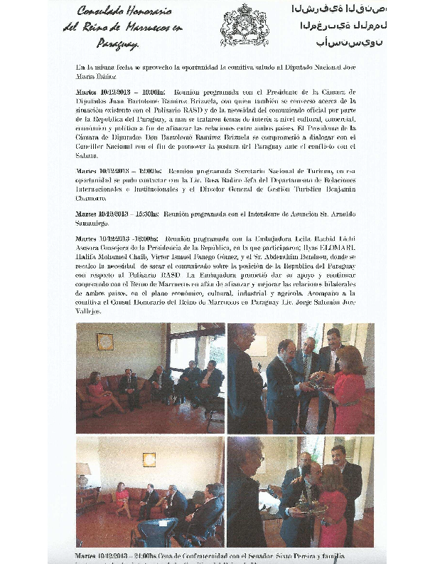 – Rappeler, par ailleurs, que M. Hamed Franco, ex Ministre paraguayen des Relations Extérieures, avait annoncé, lors de sa visite au Maroc en qualité de Ministre Conseiller Diplomatique du Président paraguayen, le 19 juillet 2009, le souhait du Paraguay de procéder à la nomination de Consuls Honoraires au Maroc notamment à Tanger, à Casablanca et à Laâyoune.