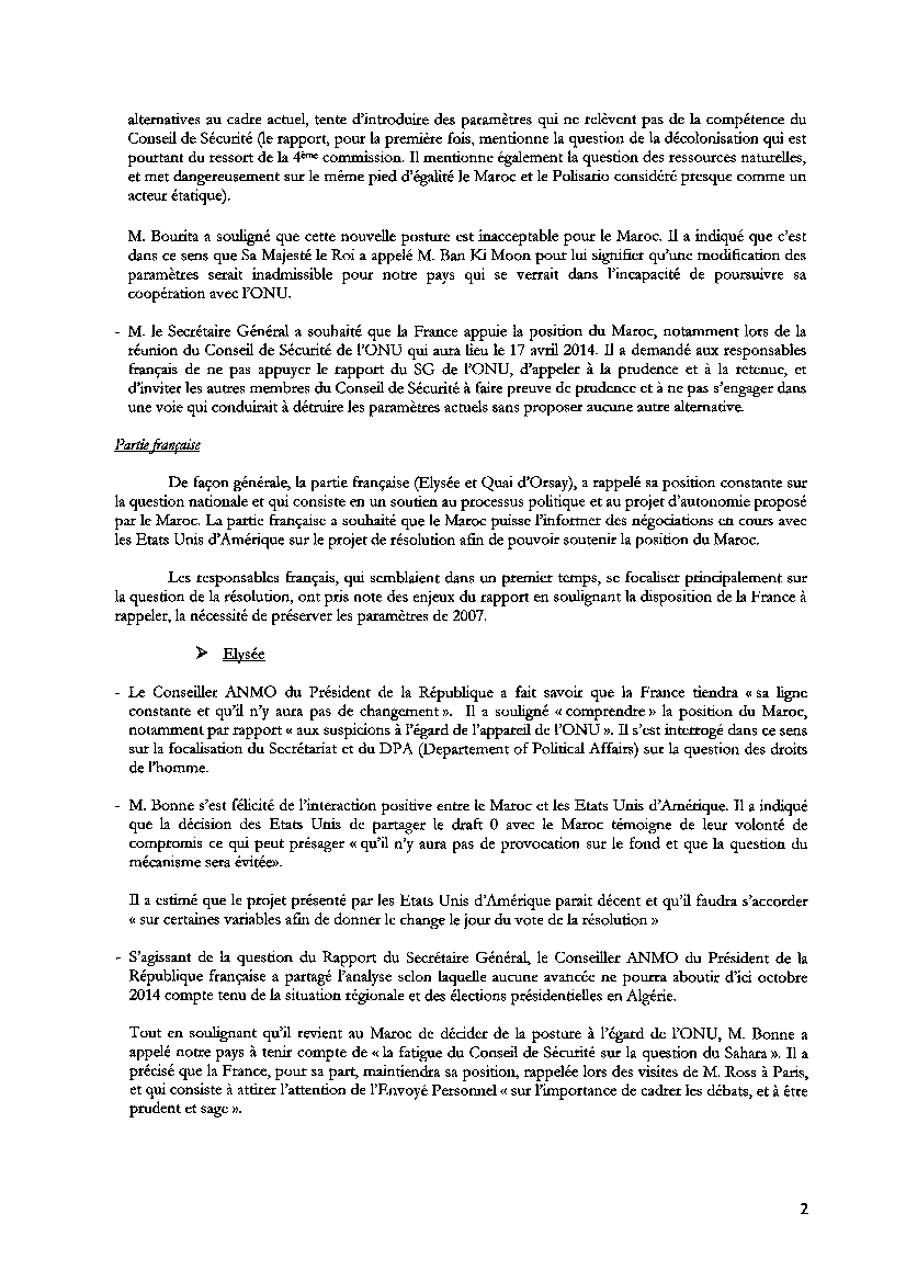 Selon le conte-rendu de cette réunion, la partie française a souhaité que le Maroc puisse l’informer des négociations en cours avec les Etats-Unis d’Amérique sur le projet de résolution afin de pouvoir soutenir la position du Maroc.