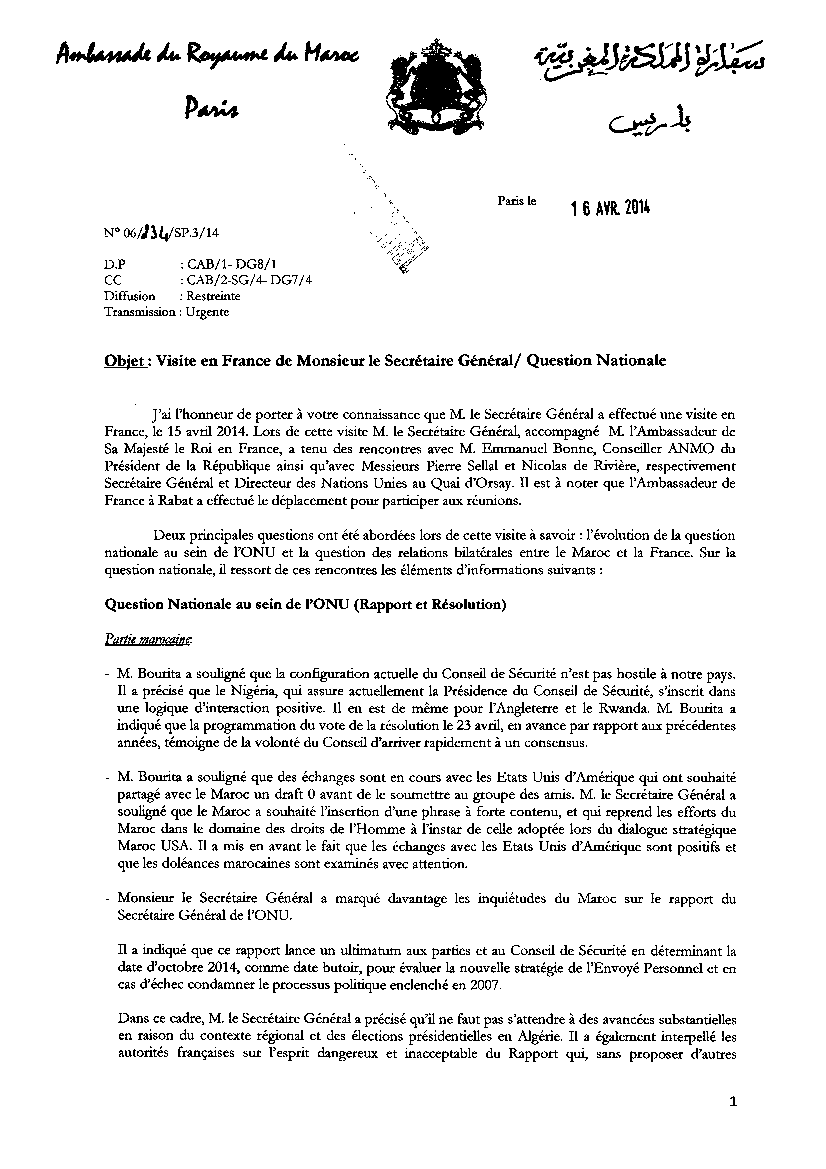 Le 15 avril 2014, c’est au tour du Secrétaire Général du MAE marocain, Nasser Bourita de se rendre à la Métropole pour quémander le soutien de l’Elysée.