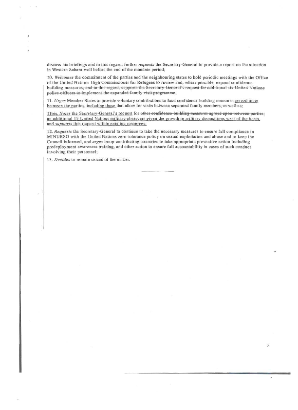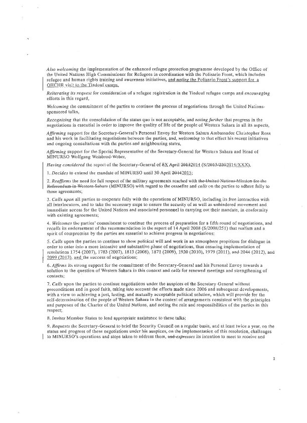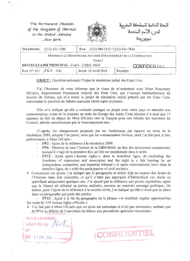 Selon une note envoyée par Mohamed Loulichki en date de 10 avril 2014, Rosemary DiCarlo, Représentant Permanent Adjoint des Etats-Unis, qui s’occupe habituellement du dossier du Sahara, lui a remis le projet de résolution initial préparé par les Etats-Unis, concernant la question du Sahara Occidental. Une copie du projet est jointe à la lettre.