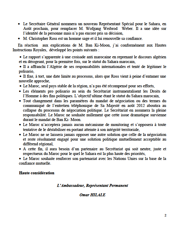 Selon la note envoyée par Hilale à ce sujet, Ban « a apprécié l’invitation qui lui a été transmise pour visiter le Maroc et le Sahara et espère l’effectuer après la tournée de M. Ross dans la région, prévue en mai 2014 ».
