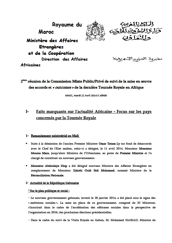 2èmeréunion de la Commission Mixte Public/Privé de suivi de la mise en œuvre des accords et « outcomes »de la dernière Tournée Royale en Afrique