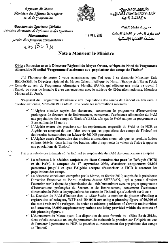 « L’Algérie exerce des pressions sur les représentants respectifs du PAM et du HCR en Algérie, en essayant de leur faire croire que les réfugiés sahraouis à Tindouf ont des besoins humanitaires sur la base de 165000 personnes ».
