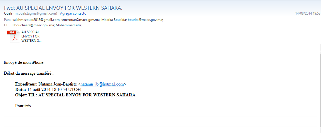 Dans ce cas, il s’agit d’une lettre que M. Natama a remis au diplomate marocain Ouali Moha Tagma. La lettre a été envoyée le 14 août 2014 par l’Ambassadeur Yilma Tadesse, représentant principal de l’Union africaine auprès de la MINURSO à El Aaiun. Elle rapporte le contenu d’un article du journal de la DGED Quid.ma sur la nomination de l’ancien président mozambicain Joachim Chissano Représentant Personnel de l’Union Africaine pour le Sahara Occidental.