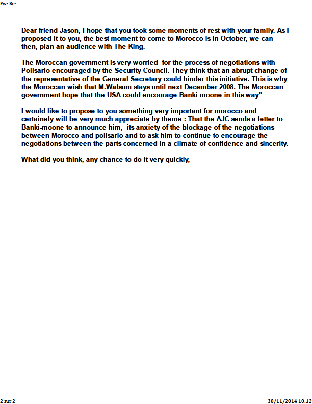 I would like to propose to you something very important for morocco and certainely will be very much appreciate by theme : That the AJC sends a letter to Banki-moone to announce him, its anxiety of the blockage of the negotiations between Morocco and polisario and to ask him to continue to encourage the negotiations between the parts concerned in a climate of confidence and sincerity.