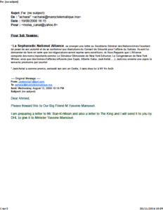 * La Sepharadic National Alliance, va envoyer une lettre au Secrétaire Général des Nations-Unies l’exortant de peser de son autorité et de se conformer aux résolutions du Conseil de Sécurité pour l’affaire du Sahara. Ils vont lui demander de faire en sorte que les négociations soient reprise sans conditions. Je Vous Rappele que L’Alliance comporte des noms importants comme Le Sénateur Démocrate de New York Schumer, Le Congressman de New York Winner, ainsi que des homes d’affaires influents (Joe Cayre, Alberto Saba, Jack Avital…..). Jack nou enverra une copie la semaine prochaine par courrier