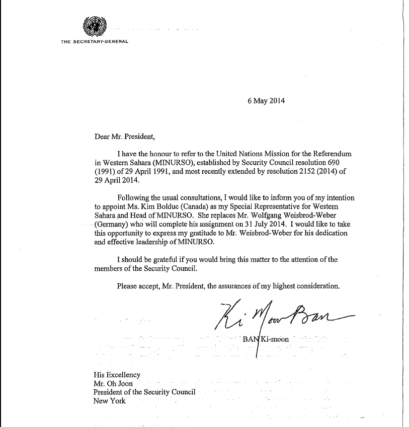 La mission des Nations unies au Sahara occidental (MINURSO) sera dirigée par la Canadienne Kim Bolduc. Le secrétaire général Ban Ki-moon l’a nommée au mois de mai 2014 à ce poste.