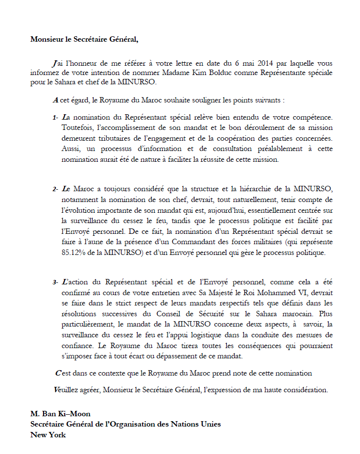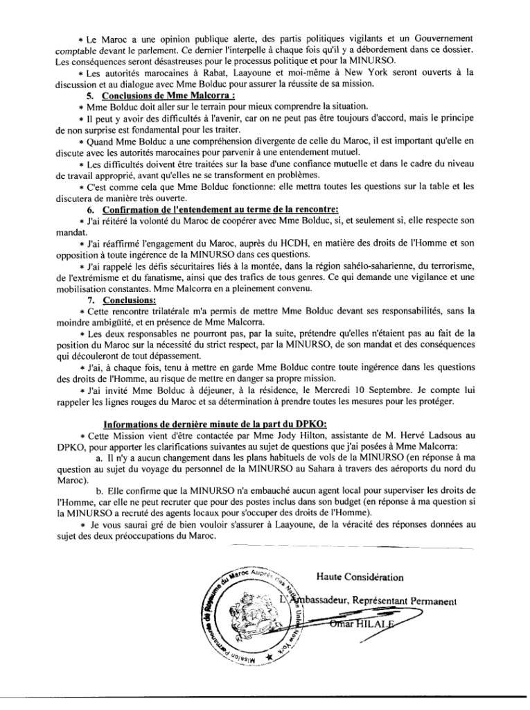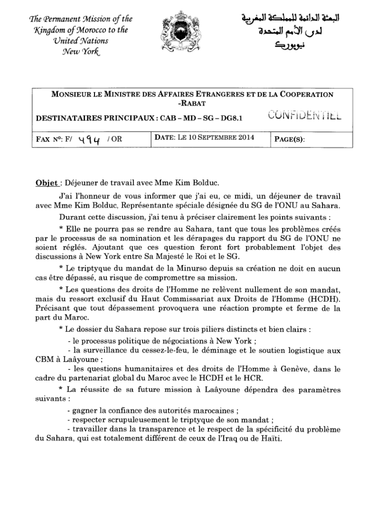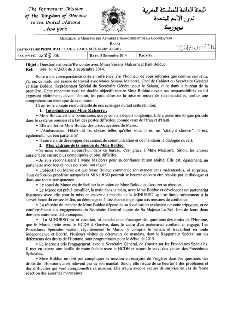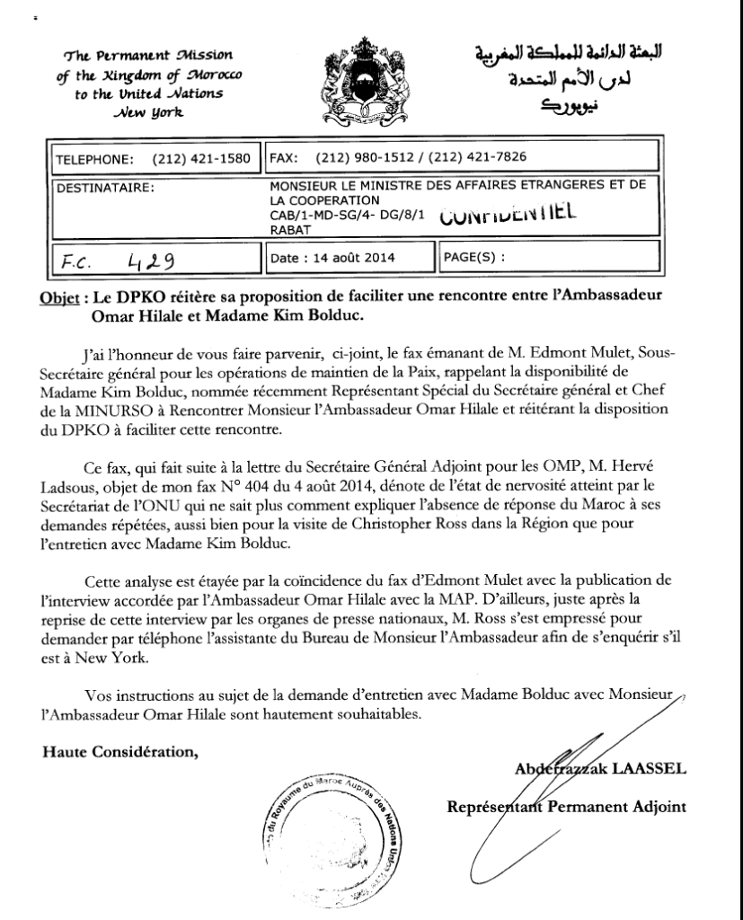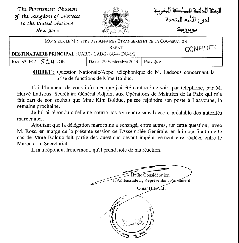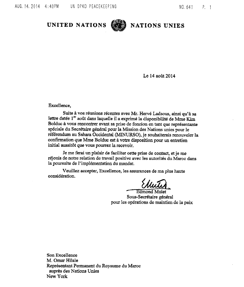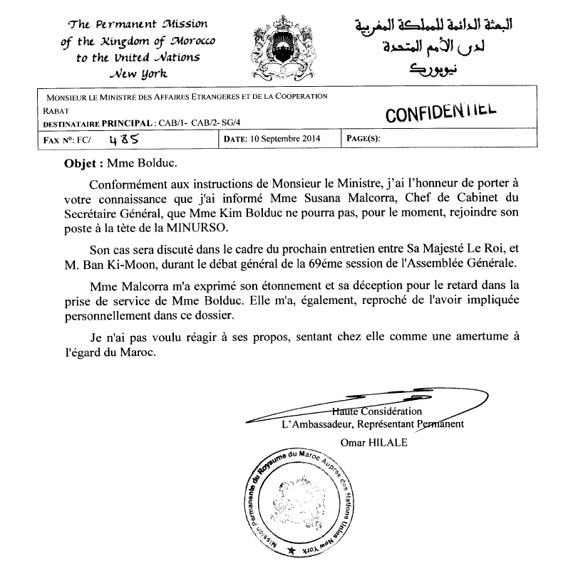 En date du 3 septembre 2014, l’Ambassadeur du Maroc à l’ONU, Omar Hilal, a organisé une rencontre avec Mme Susana Malcorra, Chef de Cabinet du Secrétaire Général et Kim Bolduc, Représentant Spécial du Secrétaire Général pour le Sahara Occidental, en rappelant que ce dernier avait été empêché par le Maroc de prendre ses fonctions au sahara Occidental, provoquant une crise aigue avec les Nations Unis.