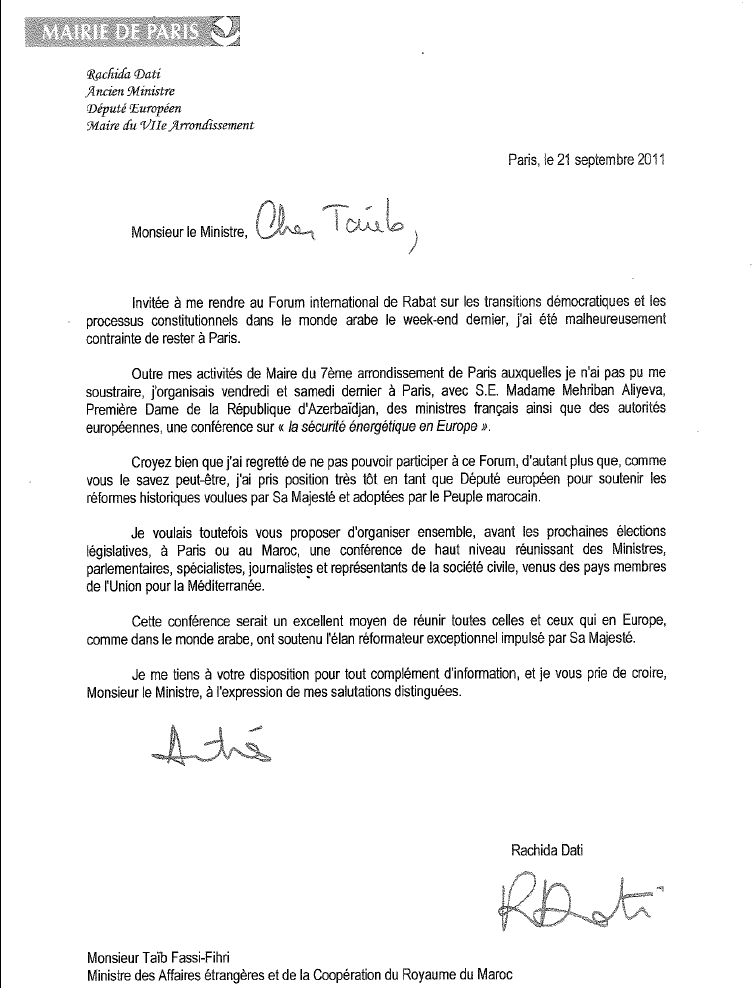 وفي رسالة أخرى مؤرخة في 21 سبتمبر 2011، قدمت رشيدة داتي اعتذارها عن عدم حضور المنتدى الدولي بالرباط، نظراً لالتزامها في باريس بمهامها كعمدة وبتنظيم مؤتمر حول الأمن الطاقي. وقد جددت تأكيد دعمها المستمر، بصفتها نائبة أوروبية، للإصلاحات الهيكلية التي باشرها ملك المغرب. كما اقترحت تنظيم مؤتمر رفيع المستوى بشكل مشترك (يضم وزراء وخبراء وممثلي المجتمع المدني) قبل الانتخابات التشريعية المقبلة، بهدف حشد الفاعلين الأوروبيين والعرب المؤيدين لدينامية الإصلاح المغربية في إطار الاتحاد من أجل المتوس